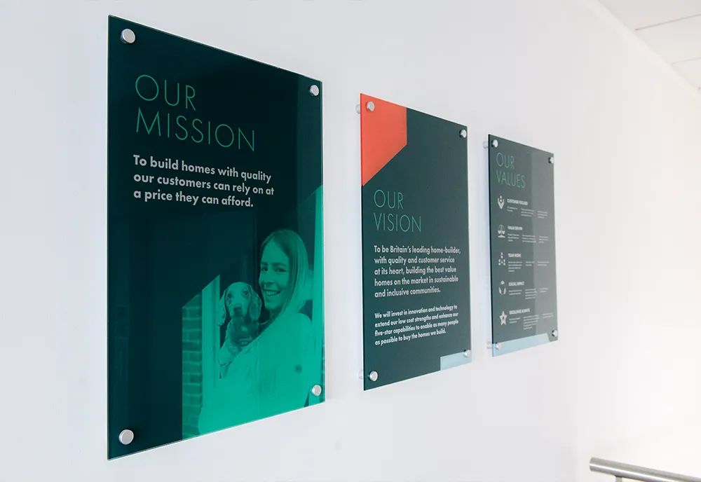 The design included bespoke reception furniture and brand-led signage, all created to align seamlessly with Persimmon Homes’ visual identity.
